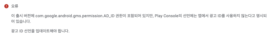 이 출시 버전에 com.google.android.gms.permission.AD_ID 권한이 포함되어 있지만, Play Console의 선언에는 앱에서 광고 ID를 사용하지 않는다고 명시되어 있습니다.