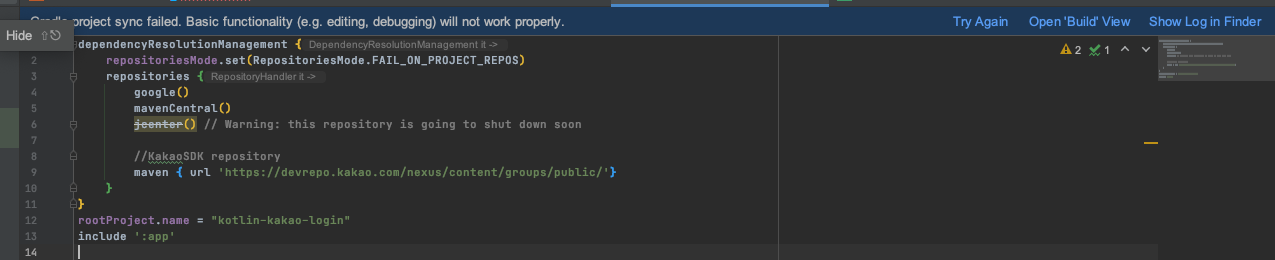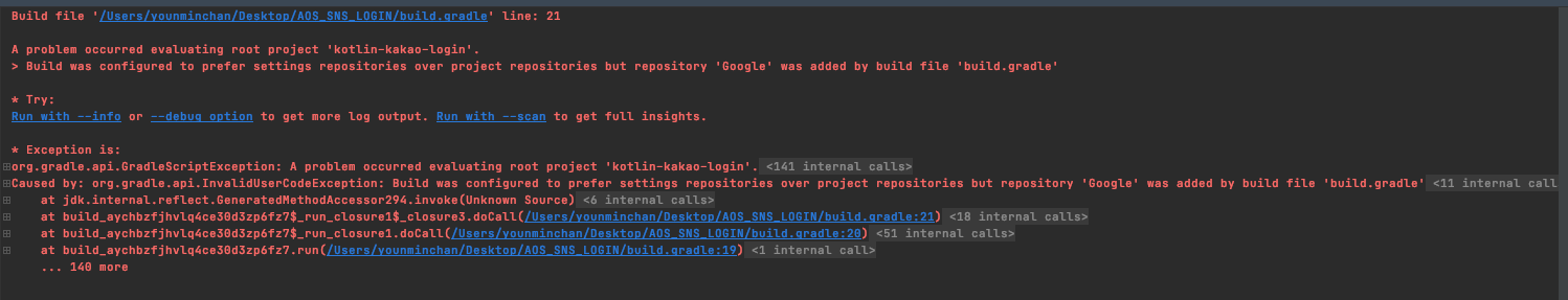build.gradle에 KakaoSDK를 추가시키기 위해서 다음을 추가하는 과정에서 다음과 같은 오류를 만나게 되었다.